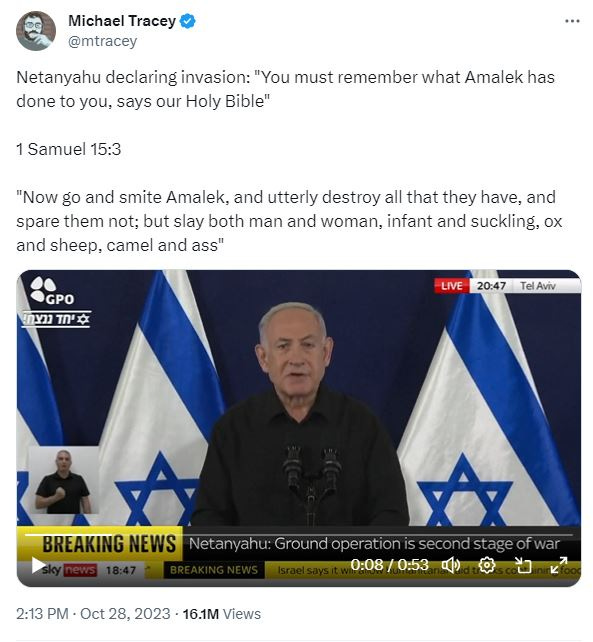 “You must remember what Amalek has done to you, says our Holy Bible. And we do remember. And we fight. Our brave troops and combatants who are now in Gaza and in all other regions in Israel, are joining the chain of Jewish heroes, a chain that has started 3,000 years ago, from Joshua ben Nun, until the heroes of 1948, the Six-Day War, the October 73 War, and all other wars in this country. Our hero troops, they have one supreme main goal: to completely defeat the murderous enemy, and to guarantee our existence in this country.” B.Netanyahu, October 28, 2023: Link